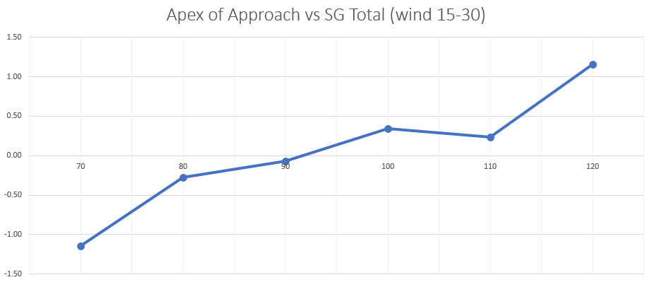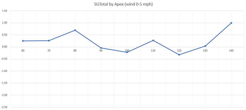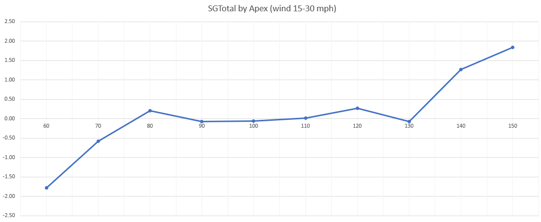 This is nearly identical to the Driver chart above, you can see a clear advantage for higher ball flights in high wind rounds, with players that have the lowest Apex performed signifantly worse. This is a clear trend for both Driving and Approach play that higher Apex is actually more correlated with good scores than lower Apex.