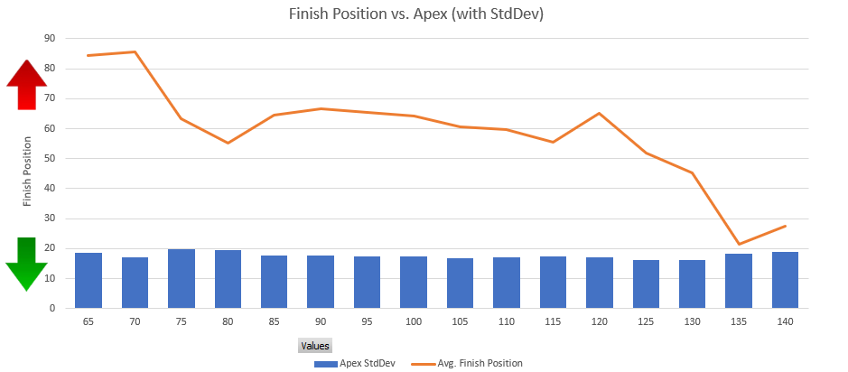 Below is a chart illustrating the Average Finish Position in an Event by Average Apex Height in that event.