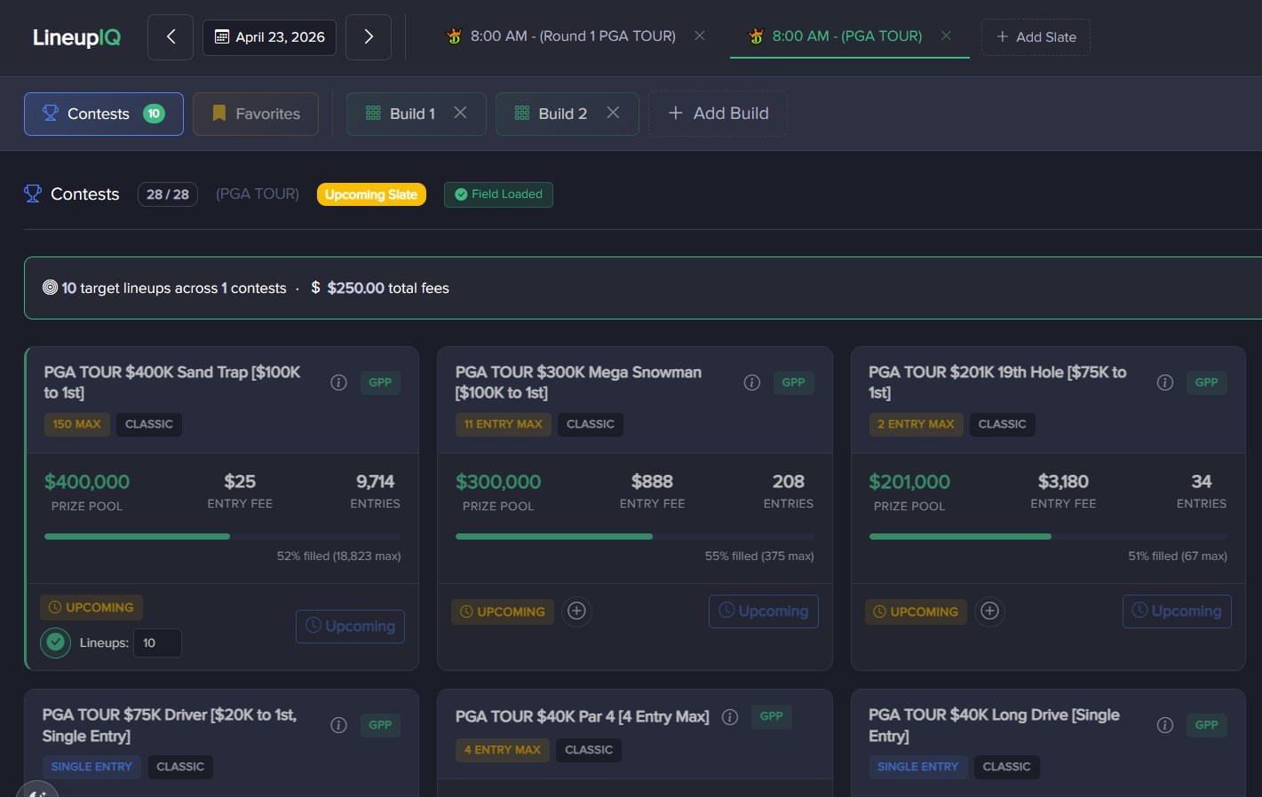LineupIQ makes it incredibly easy to build lineups and simulate with confidence knowing your final allocation of lineups are the best of your custom pool.