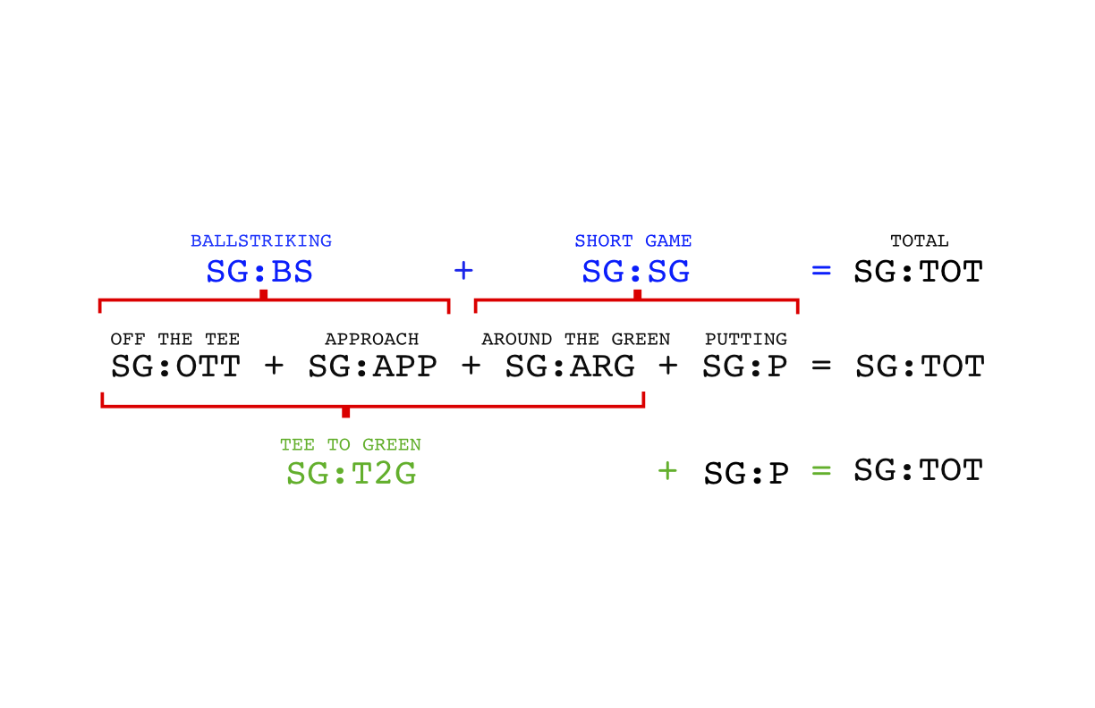 Strokes Gained is a broadly used term in the PGA gambling space, but it refers to any of the categories of stats as shown below. SG:Total is essentially the scoring average relative to the field (in reverse), for example if a player shoots -2 on a round when the field's scoring average was -1, then their SG:Total would be +1. Mark Broadie (the inventor of Strokes Gained) took this breakout a step further with the addition of SG:Putting and SG:T2G. Basically this allowed PGA Tour fans to see how a player performed in their SG:Total value, broken out between Putting and everything else Tee-to-green. Since then, the PGA Tour further broke out SG:T2G but separating SG:OTT (Off the tee), SG:APP (Approach) and SG:ARG (Around the green). This is where the first issue arose in Strokes Gained metrics and the way they are used today.