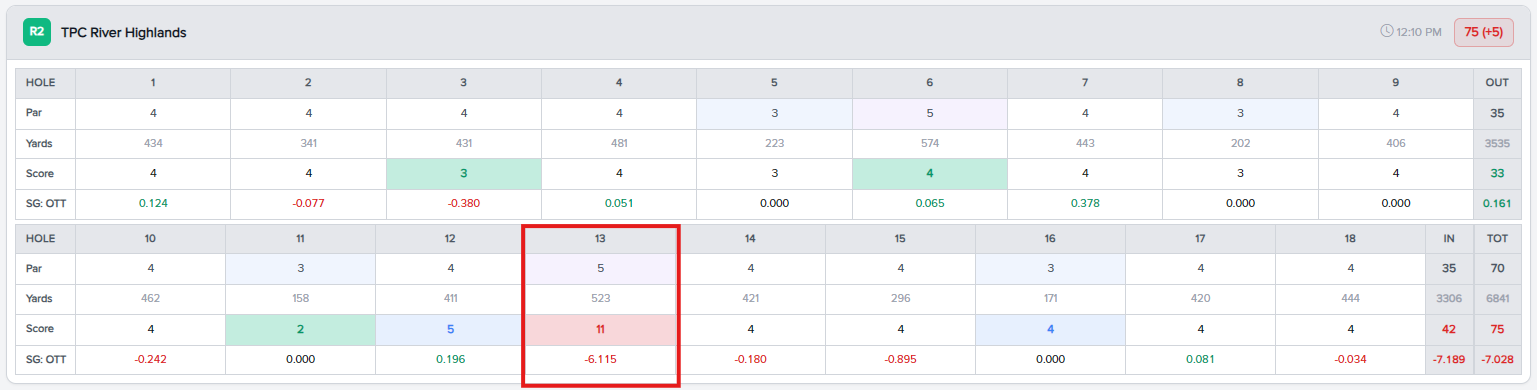 This player had a reasonable event at the Travelers Championship until a debacle on Hole 13 where they lost 6.1 SG:OTT on that single hole. With SG, this all gets aggregated the same. Spectrum Identified this and instead of a round that shows the player lost 7 strokes OTT, Spectrum shows they actually lost only 0.4 SG:OTT. This would otherwise not even be noticeable. But what happened next?